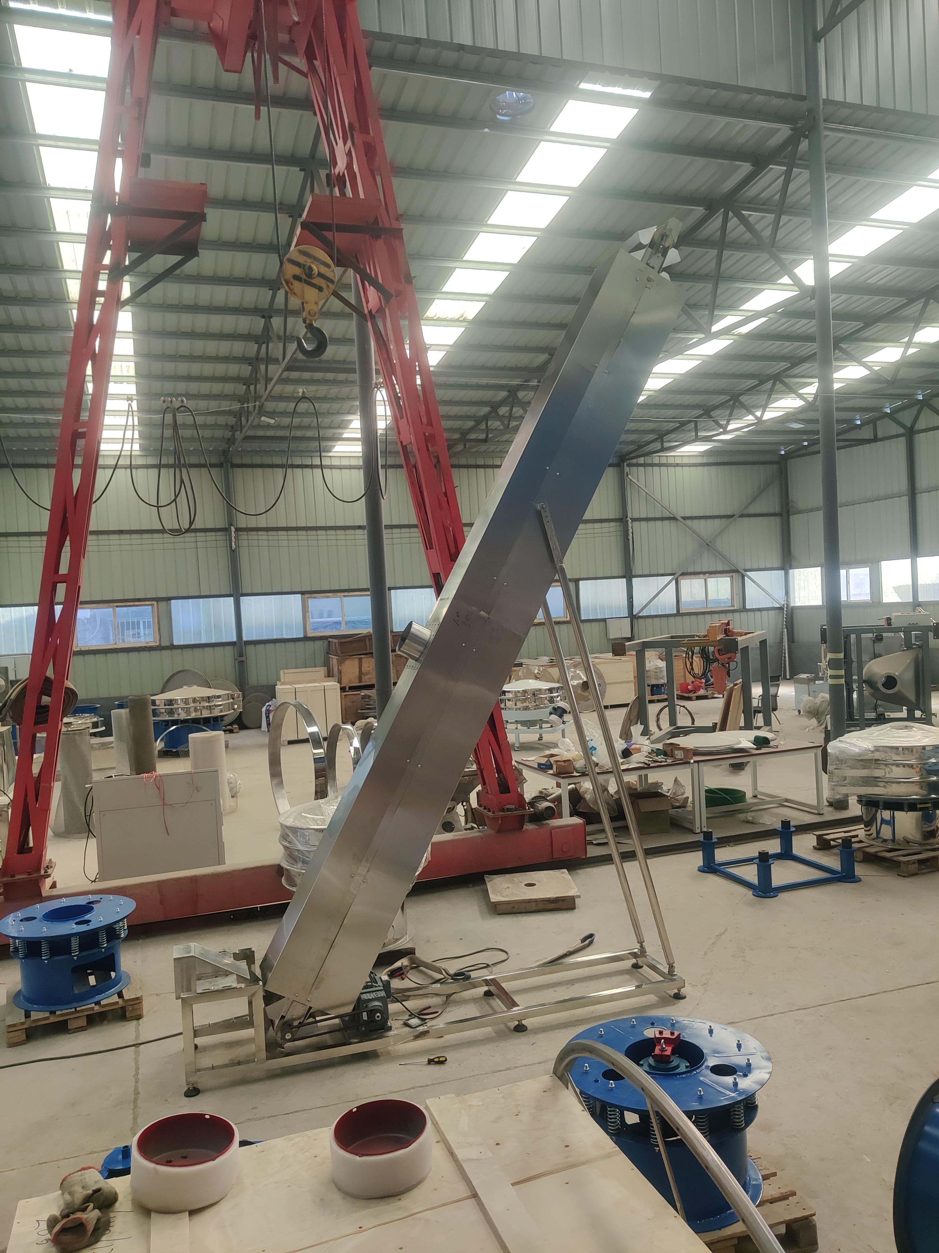 斗式提升機(jī)利用料斗帶與頭輪傳動(dòng)軸之間的摩擦力矩提升物料。如果料斗帶張力不足,料斗帶就會(huì)打滑。此時(shí),應(yīng)立即停止,并調(diào)整張緊裝置以拉緊料斗帶。如果張緊裝置不能完全張緊料斗帶,則表明張緊裝置的行程太短,應(yīng)重新調(diào)整。正確的解決辦法是:解開料斗帶接頭,將底輪上的張緊裝置調(diào)至***在高位置,料斗帶由提升機(jī)機(jī)頭放入,穿過頭輪和底輪,首尾連接,使料斗帶處于張緊而不張緊的狀態(tài)。然后完全張緊張緊裝置。此時(shí),未使用張緊裝置的調(diào)節(jié)螺釘?shù)膹埦o行程不應(yīng)小于整個(gè)行程的50%。